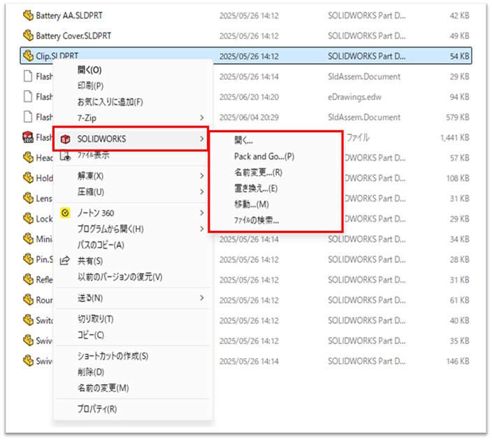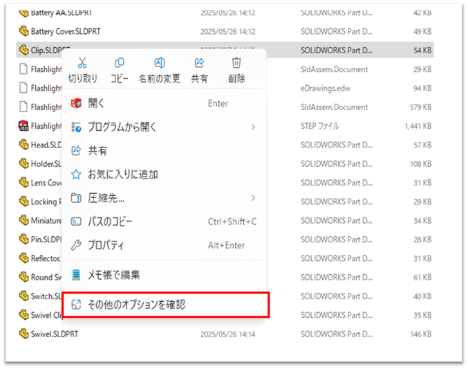 SOLIDWORKSファイルを右クリックし、表示されたメニューから [その他のオプションを表示] をクリックしてください。