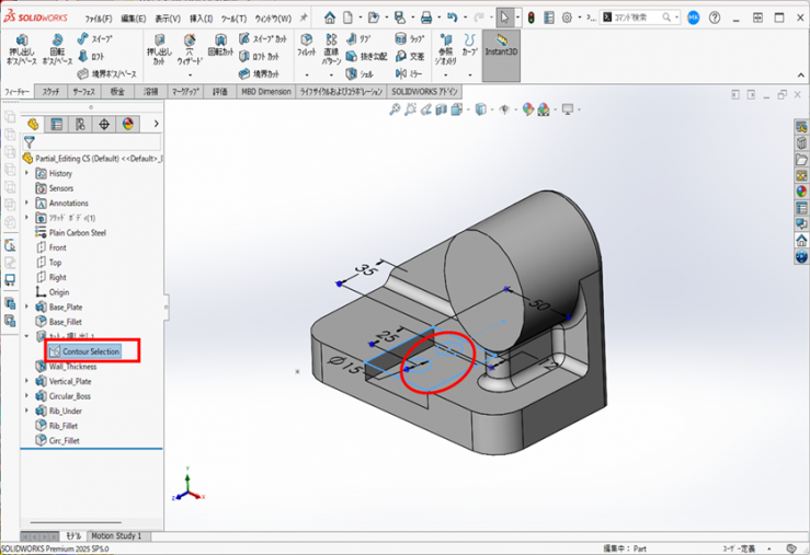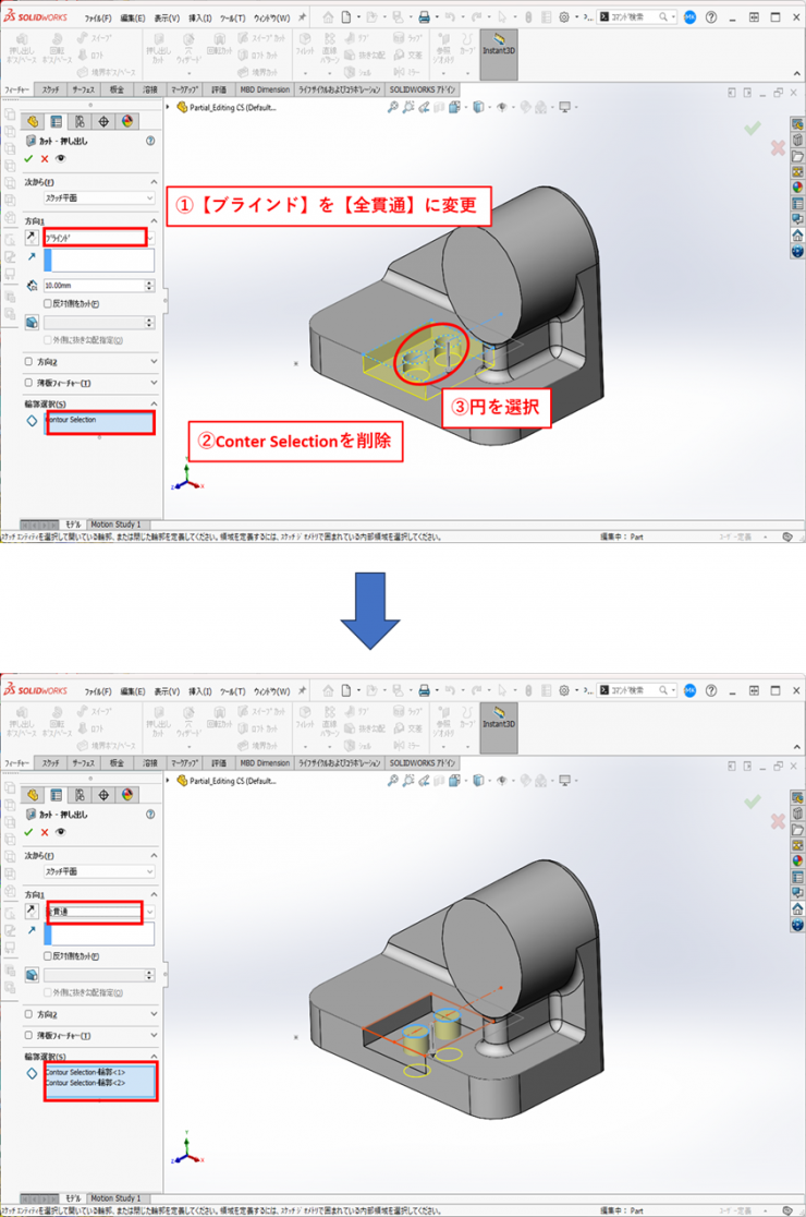 【例】カットー押し出し1で使用されているスケッチ(Contour Selection)に作図されている円を全貫通させます。