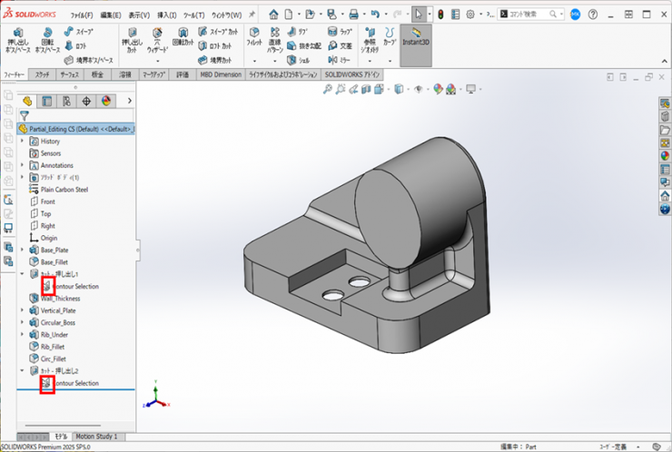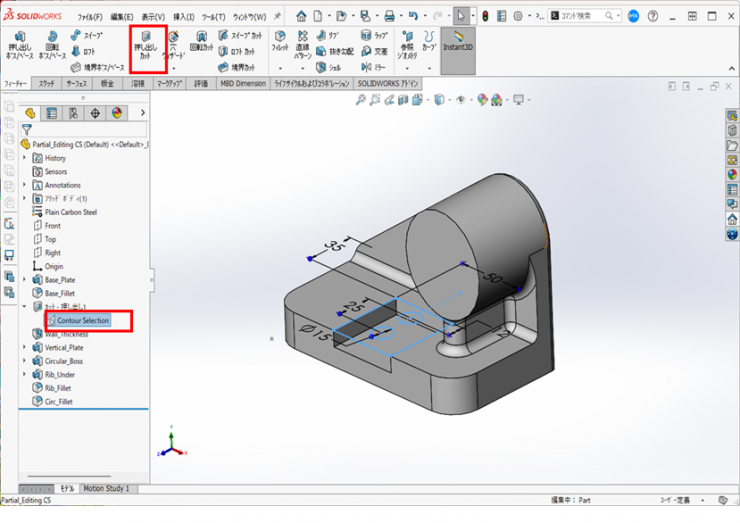 1.FeatureManagerデザインツリーから【スケッチ(Contour Selection)】をクリックして、フィーチャータブの【押し出しカット】アイコンをクリックします。