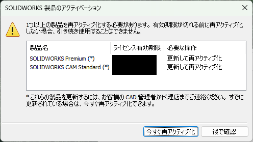 Q. SOLIDWORKSを起動時に「再アクティブ化が必要です」とメッセージが表示されます。どのように対応すればよいでしょうか。