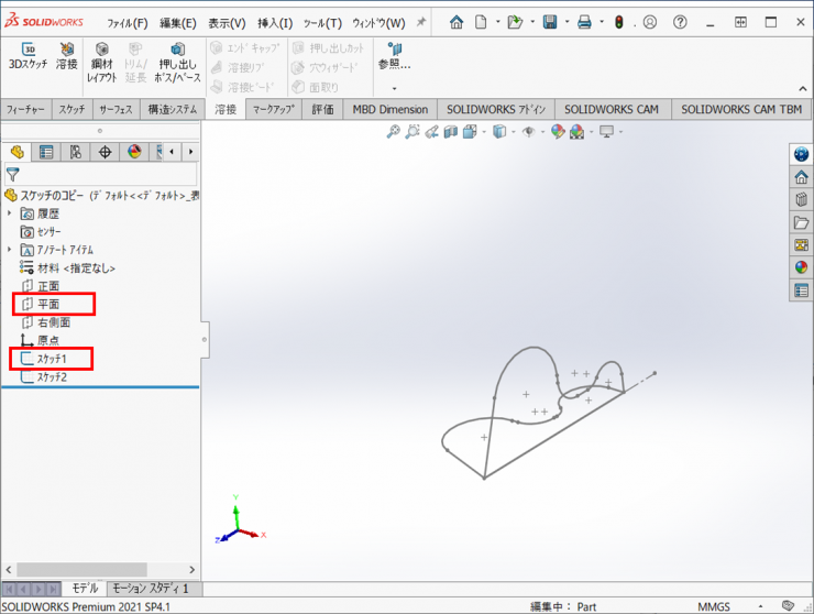 2.Featuer Managerデザインツリーより、初めに作図したスケッチをクリックして、【Ctrlキー】を押したまま【平面】をクリックします。