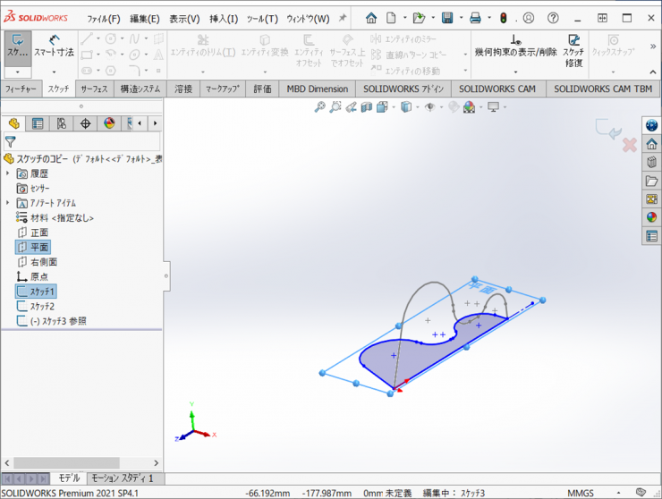 よく似た形状をスケッチする場合、平行な平面であればエンティティ変換を使用されると思います。しかし、平面に書いてあるスケッチを右側面に作図する場合は、エンティティ変換を使用できません。このような場合は、スケッチのコピーを使用します。