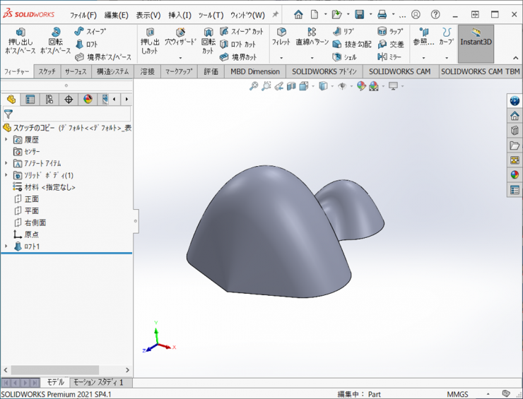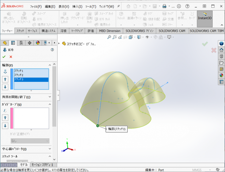 11.フィーチャータブの【ロフト】をクリックします。3つのスケッチを選択し【OK】をクリックするとロフト形状が作成されます。