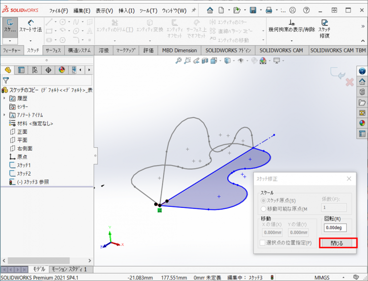 8.スケッチ修正のウィンドの【閉じる】をクリックして、スケッチ修正を終了します。