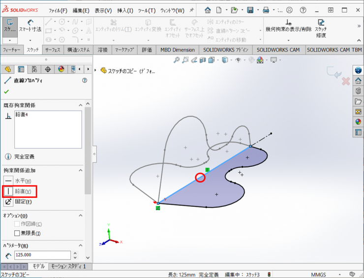 9.完全拘束されていないので、縦の直線をクリックして【鉛直】の拘束を付けます。