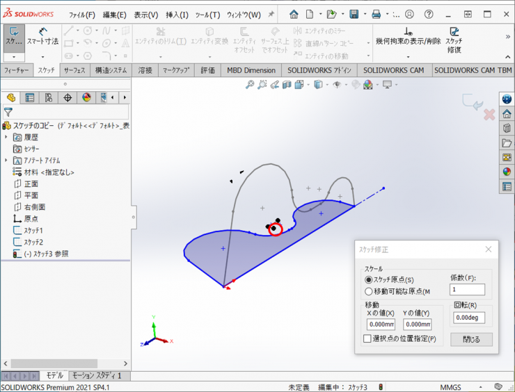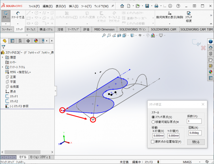 4.【ツール】>【スケッチツール】>【スケッチ修正】をクリックします。