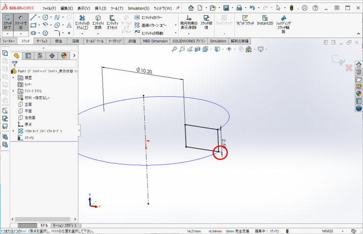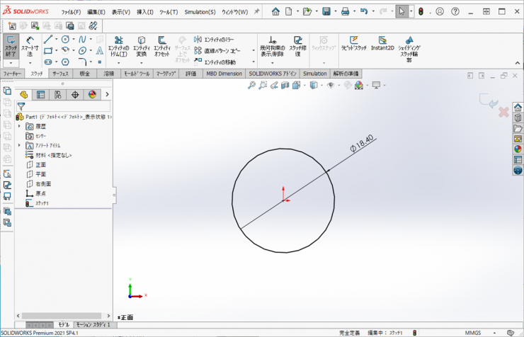 1.正面に新規スケッチを開始して、外径のφ18.4の円を作図します。