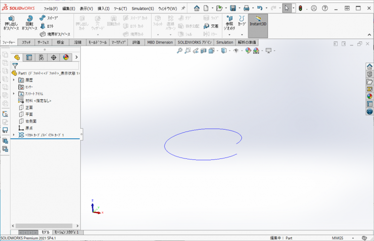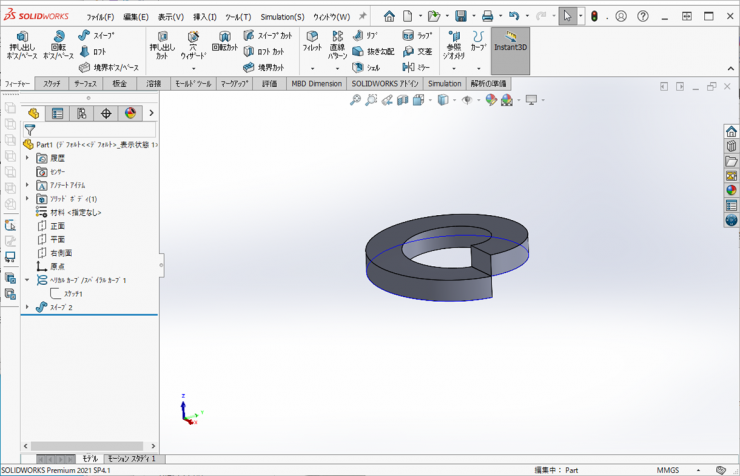 4.スケッチを終了して、フィーチャータブの【スイープ】を選択します。