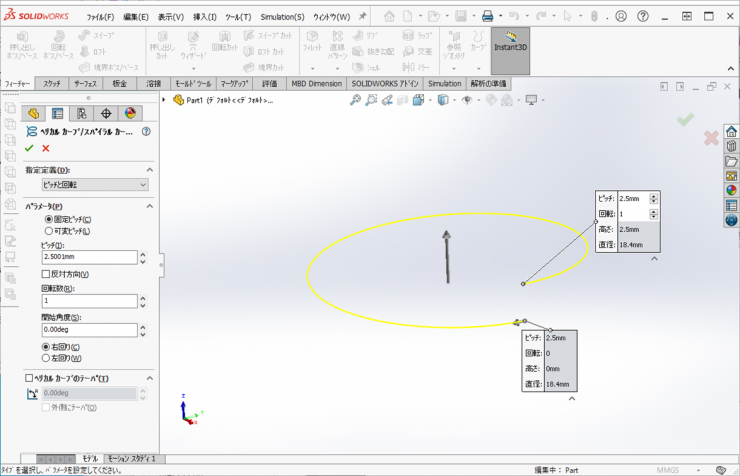 ※ピッチを2.5001とするのは、2.5にするとスイープで作成したときにうまくいかないためです