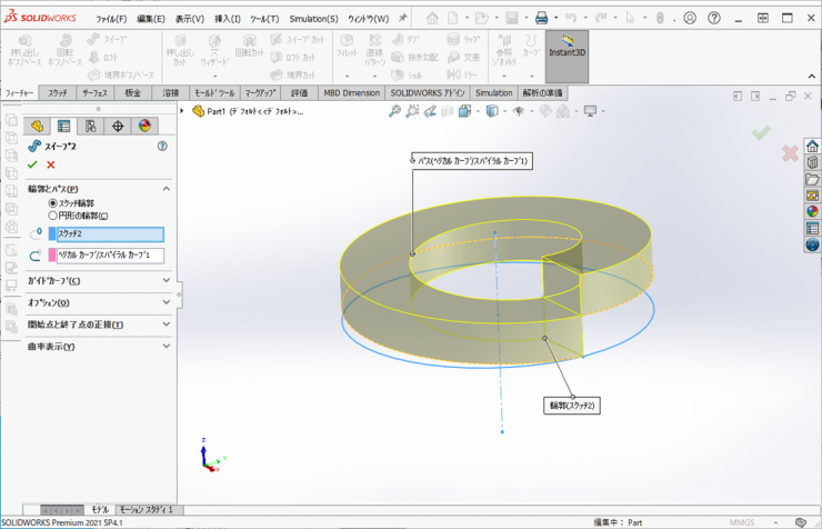 輪郭に3.で作成したスケッチをパスに2.で作成したカーブを選択します。