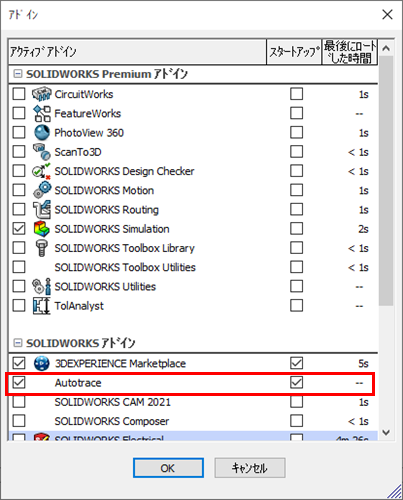 2.【Autotrace】の【アクティブアドイン】と【スタートアップ】にチェックを入れます。