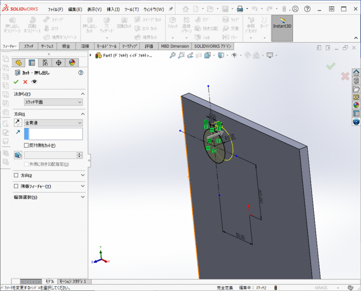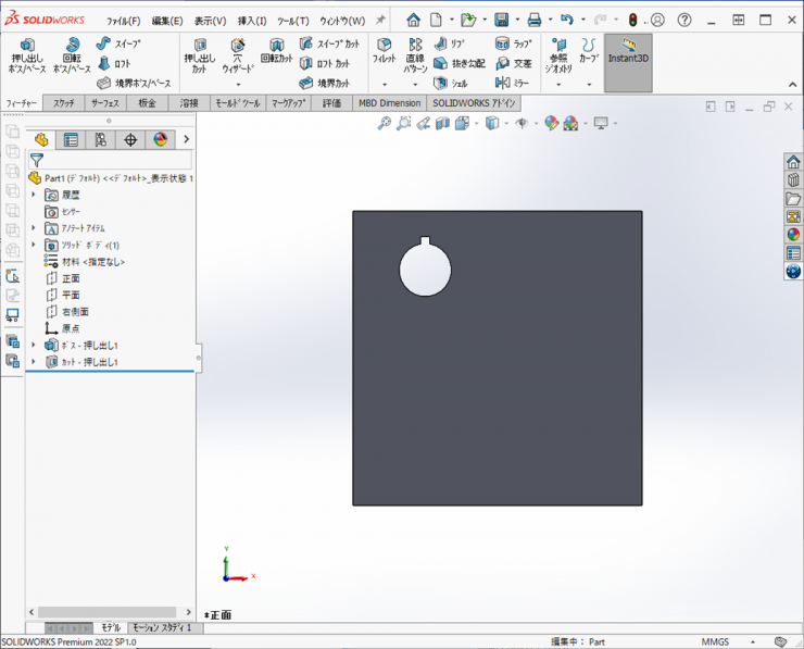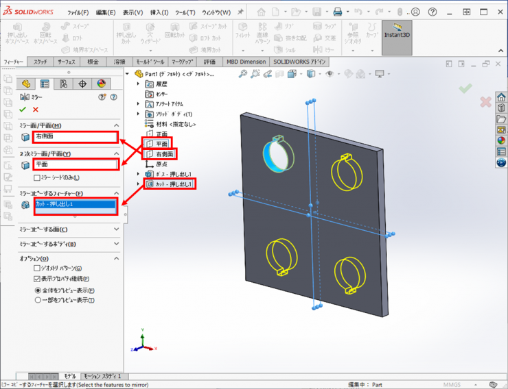 ミラーコピーするフィーチャーにFeatureManagerデザインツリーから5.で、作成した【カット-押し出し】フィーチャーを選択してください。