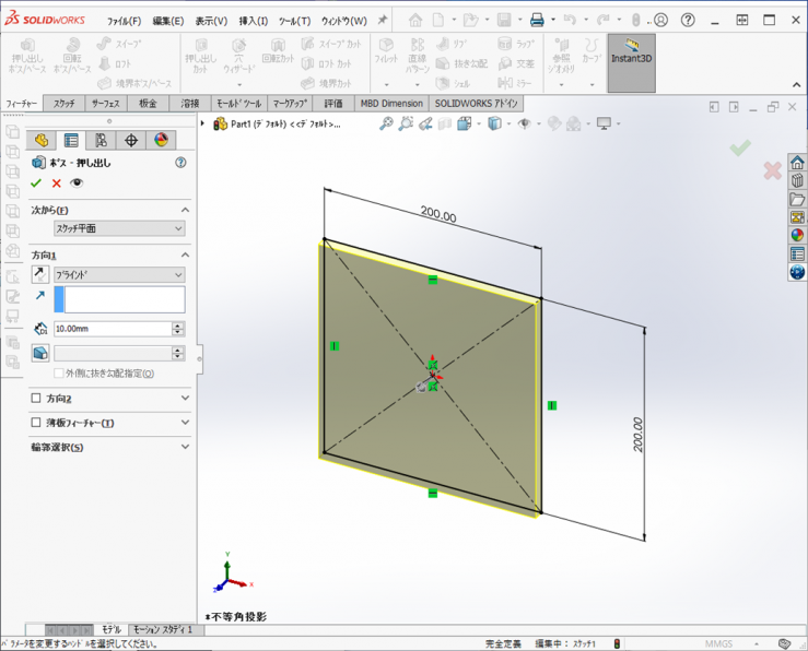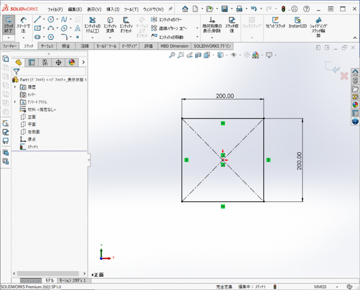 1.正面にスケッチを開始し、【矩形中心】コマンドで、原点を中心に200角の正方形を作図します。