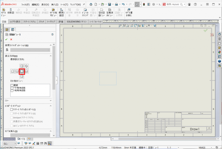 ⑤図面ビューのProperty Managerが開きますので、表示方向を【正面】にして、【OK】をクリックします。