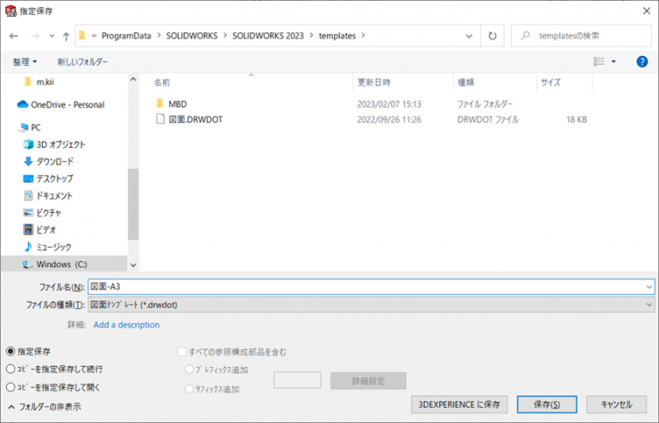 ※デフォルトでは、C:¥ProgramData\Solidworks\SOLIDWORKS 20XX\templatesです。