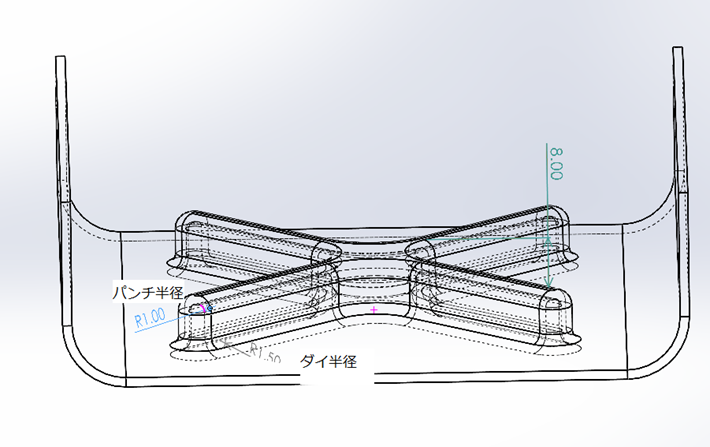 スタンプの深さに【8mm】、フィレットのダイ半径に【1.5mm】、パンチ半径に【1mm】を入力し、【OK】をクリックします。