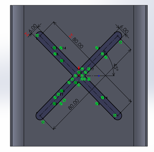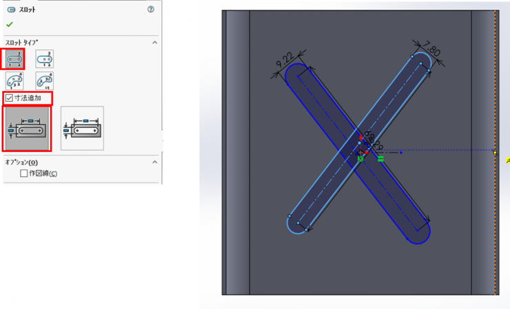 ⑤【スマート寸法】コマンドで、1つのスロットの中心線と一番初めに作図した、水平の作図線に【45度】の寸法を追加します。
