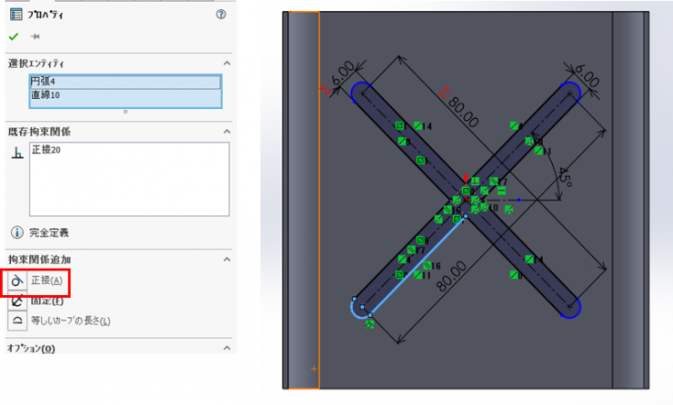 ⑪半円と直線をCtrlキーを押下しながら選択し、【正接】の拘束を追加します。