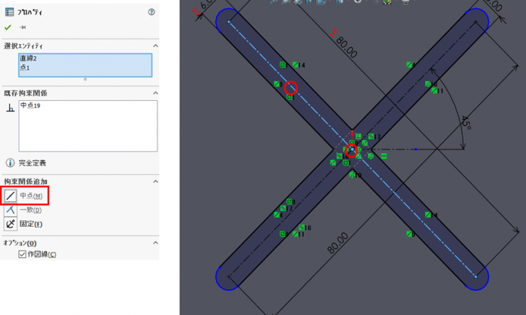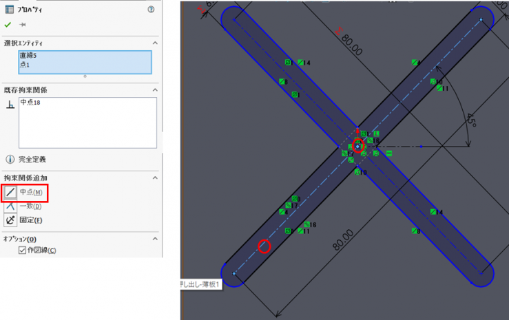 同様にもう1つの中心線も【中点】の拘束を追加します。