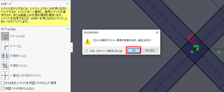※下図の丸の個所をトリムしようとすると下図のメッセージが表示されます。【OK】をクリックしてください。