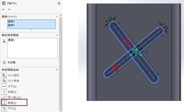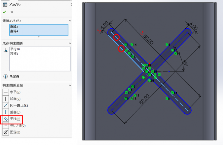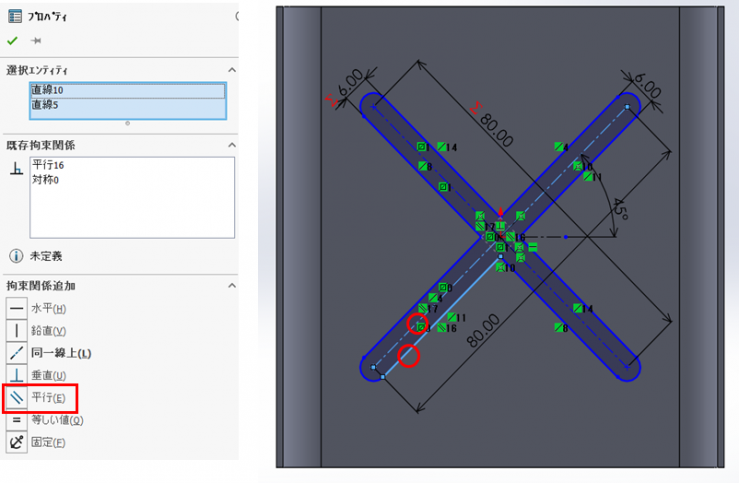 ⑨下図の様に2つの線をCtrlキーを押下しながら選択し、【平行】の拘束を付けます。