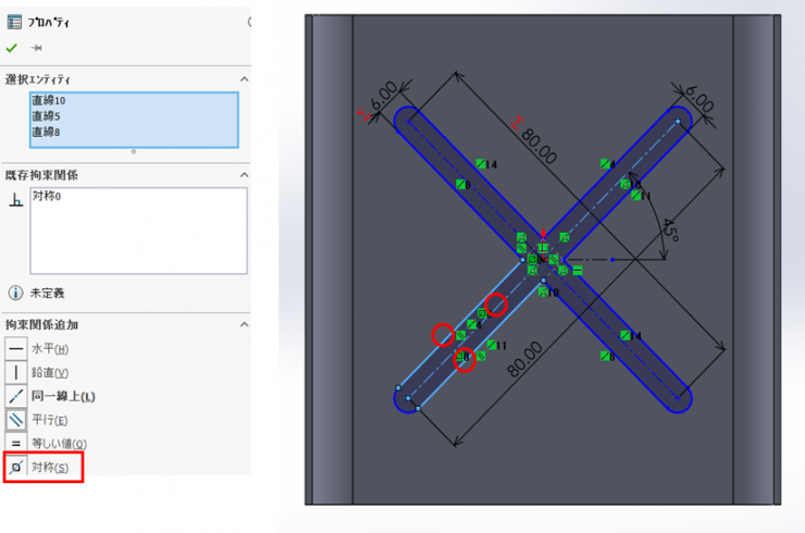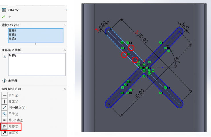 ⑧下図の様に3つの線をCtrlキーを押下しながら選択し、【対称】の拘束を付けます。