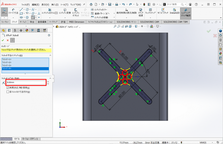 ⑫スケッチフィレットコマンドを使用して、R8のフィレットを追加します。