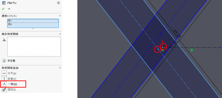 ③スロットの中点がありますので、中点と原点をCtrlキーを押下しながら選択し、【一致】の拘束を追加します。※2つのスロットとも設定します。