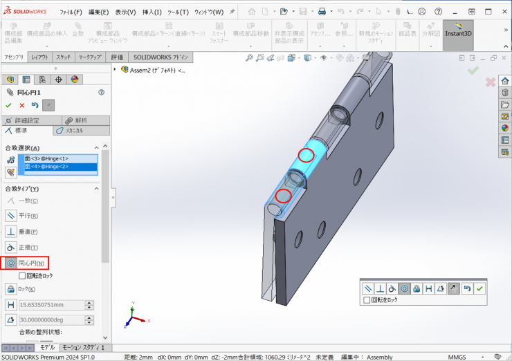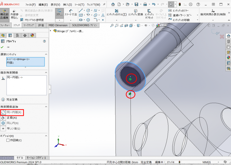 ⑦円筒面を選択し、【同心円】の合致を追加します。