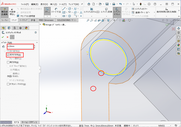 ②内側のエッジを選択し、スケッチタブの【エンティティオフセット】アイコンをクリックし、【0.25mm】、内側にオフセットした図形を作図します。