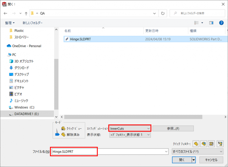 ①前回作成しました【Hinge.sldprt】をコンフィギュレーション【InnerCuts】で開きます。