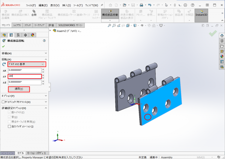 【デルタXYZ基準】を選択し、後から挿入したモデルを選択し、デルタYに【180】と入力し、【適用】ボタンをクリックします。