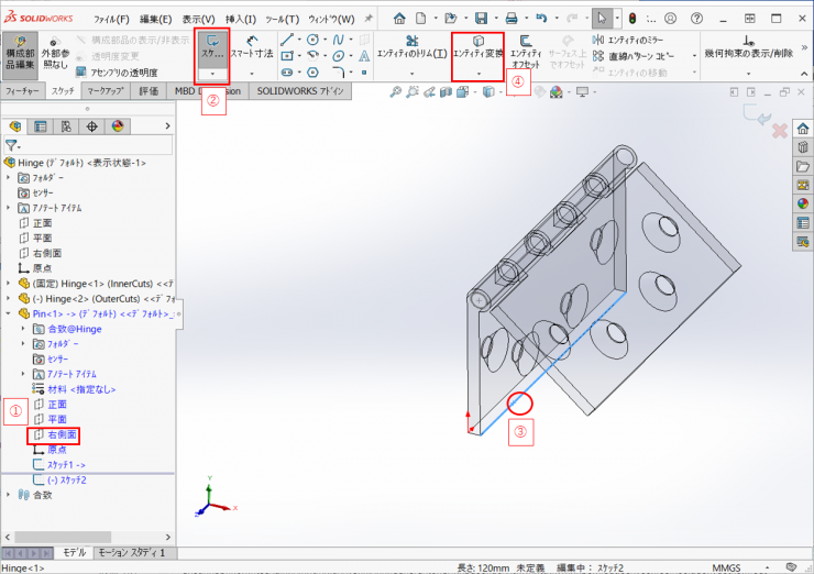 Hinge<1>の長辺の1つをクリックし、スケッチタブの【エンティティ変換】アイコンをクリックします。