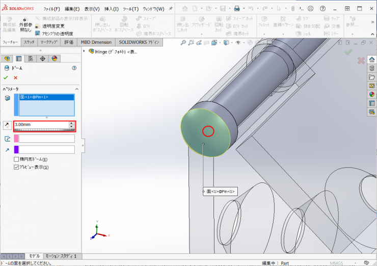 ピン先端の面を選択し、距離に【3mm】を入力し、【OK】をクリックします。