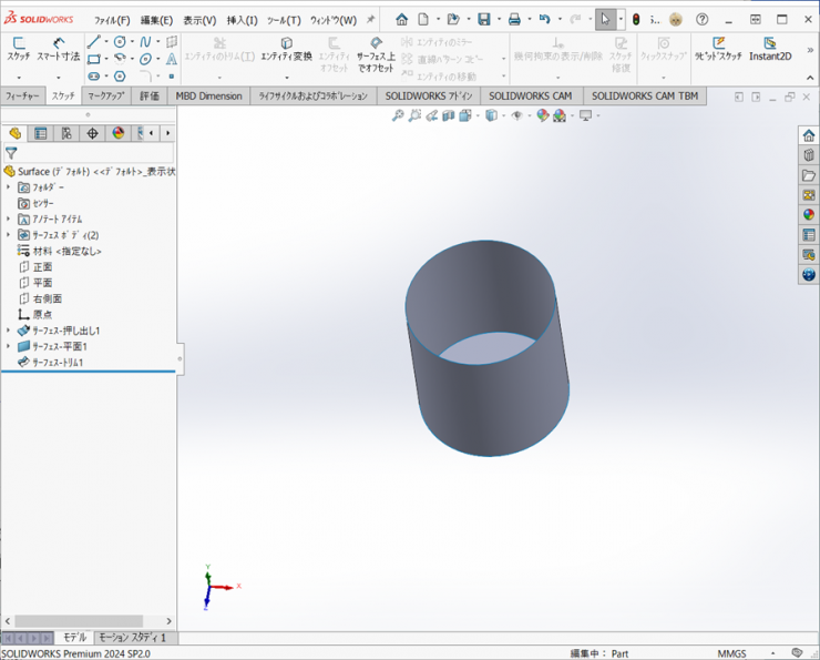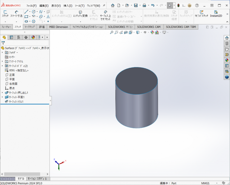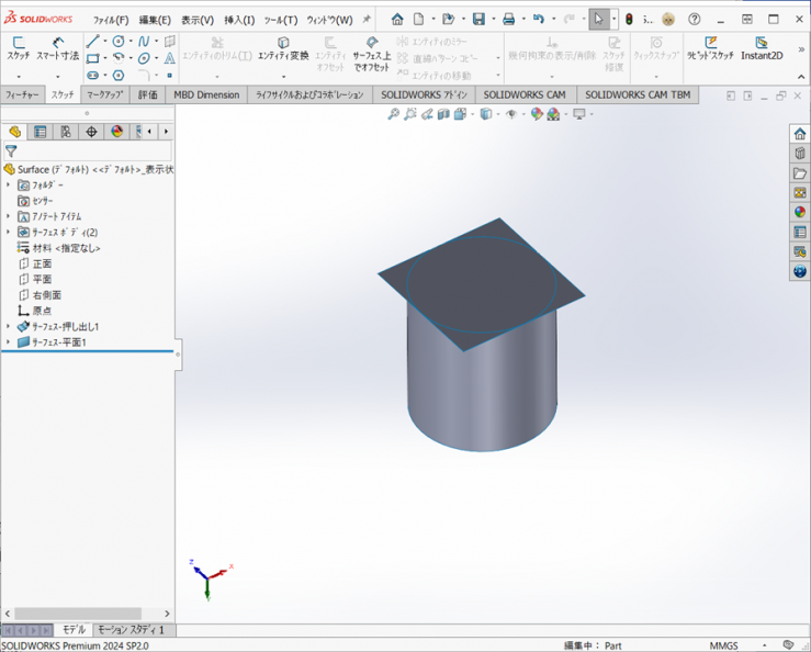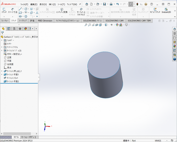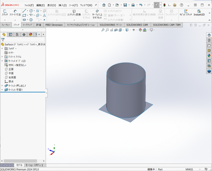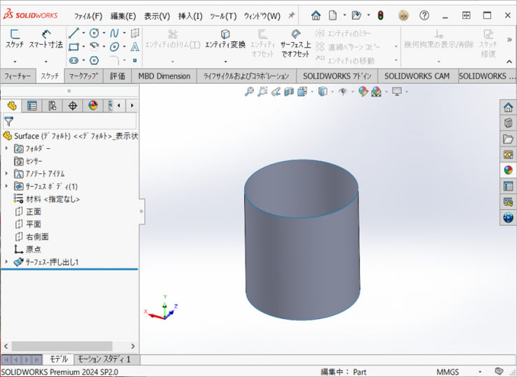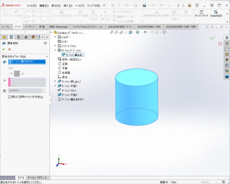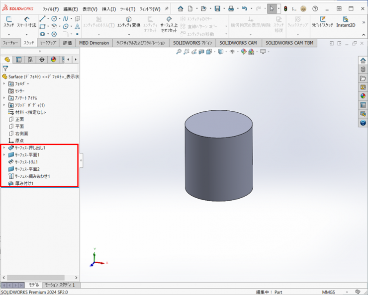 ソリッドのコマンドであれば、【押し出し-ボス/ベース】もしくは【回転-ボス/ベース】の1つのフィーチャーでできますが、サーフェスは、フィーチャーの数が多くなっています。