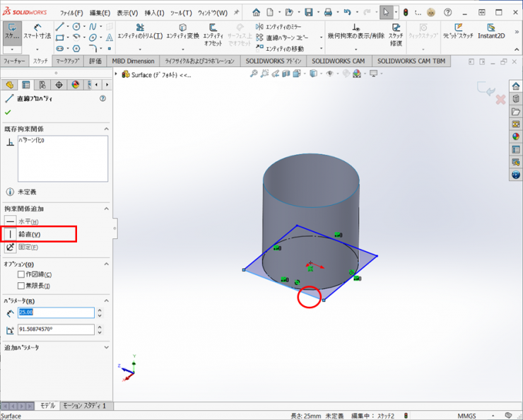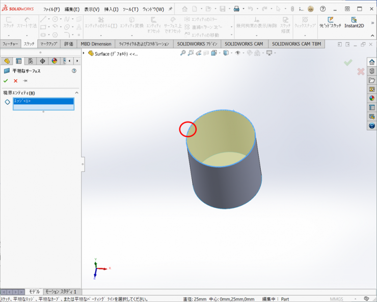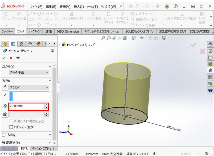 【挿入】>【サーフェス】>【押し出し】で、厚さ25mmの円筒を作成します。