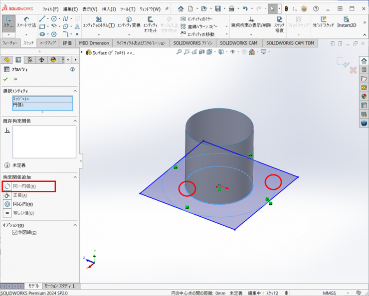 ②多角形の内接円と円筒面のエッジで【同一円弧】の拘束を追加します。