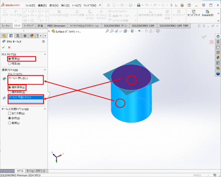 ③トリムタイプを【標準】にして、トリムツールに【円筒面】を選択し、