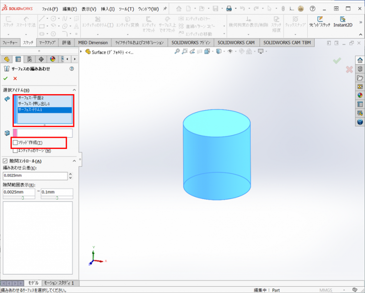 ※完全に閉じた状態の時、【ソリッド作成】にチェックを入れるとソリッドボディにしてくれます。