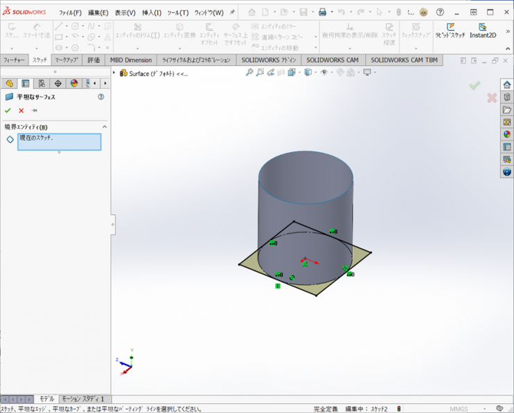 2.平面に原点を中心とし、側面が円筒面に正接する矩形の平面のサーフェスを作成します。