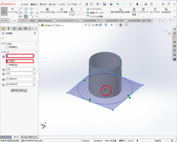 側面の数を【4】にし【内接円】を選択します。原点をクリックして、適当な位置に矩形を作図します。