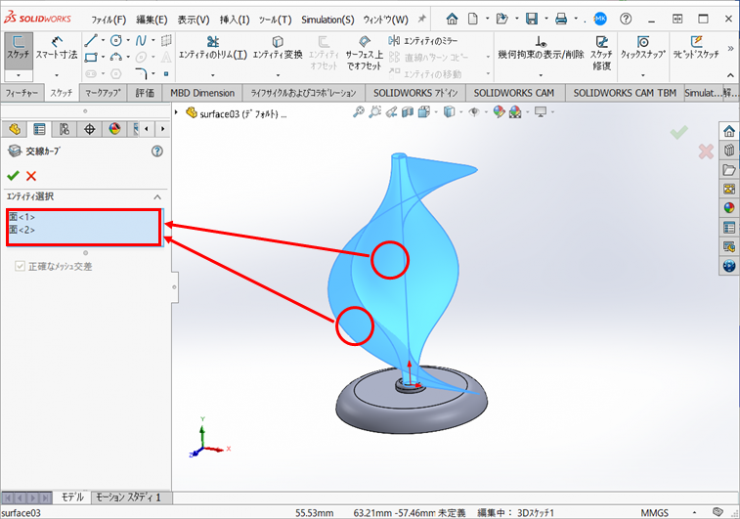 4.2.と3.で作成したサーフェスで、交線カーブを作成します。