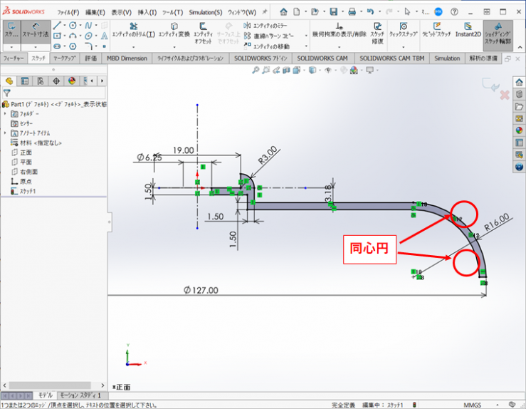 ①新規に部品ファイルを開き、【正面】に新規スケッチを開始します。