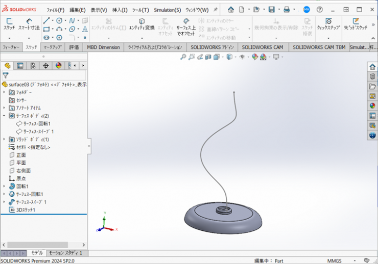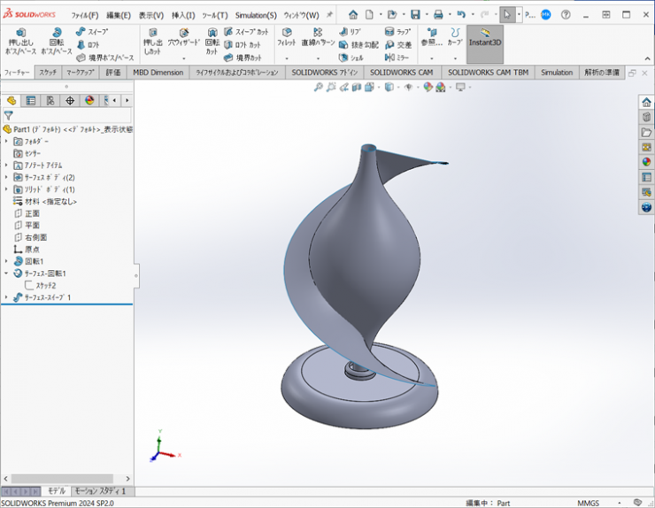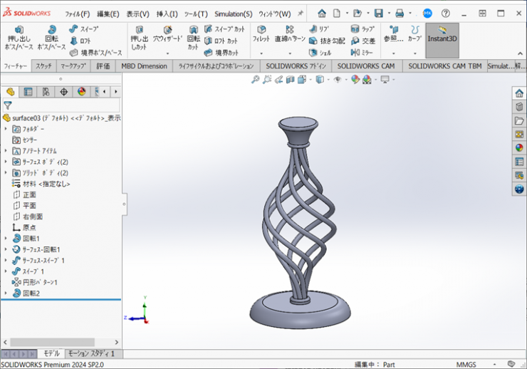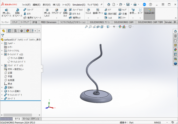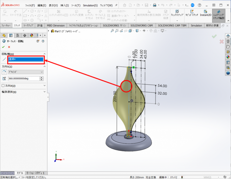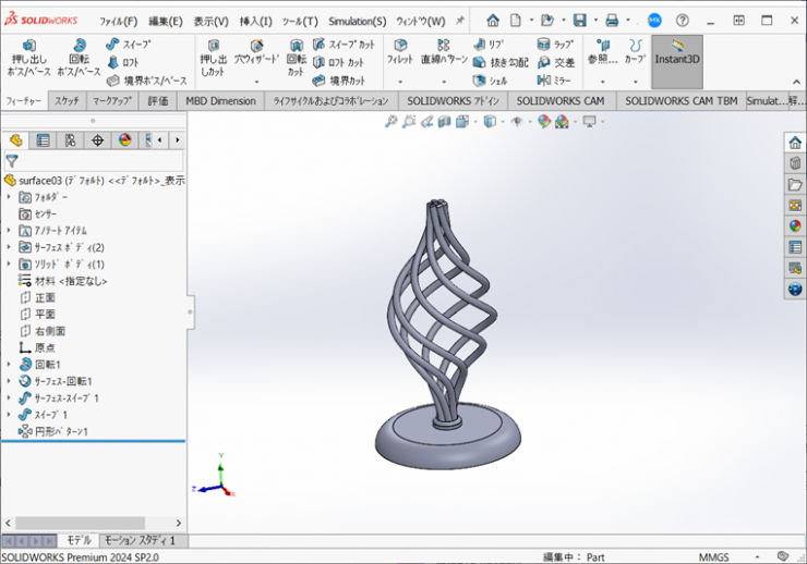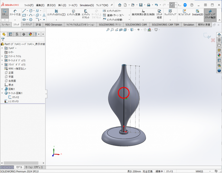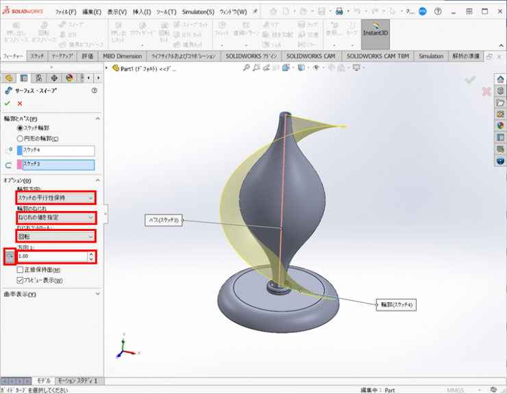 3.次にサーフェスのスイープコマンドで、高さ200mmで、1回転するサーフェスを作成します。