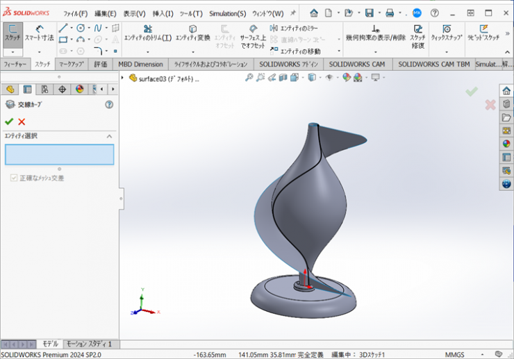 ③交線カーブが作成され、3Dスケッチが開始されます。交線カーブコマンドを終了し、3Dスケッチを終了します。