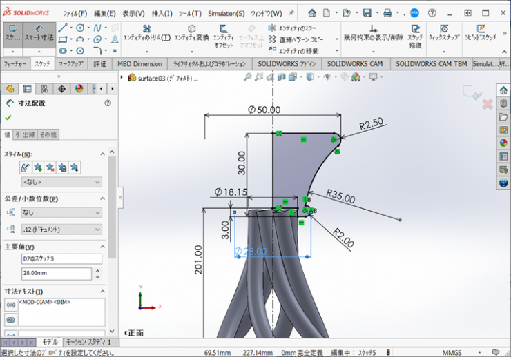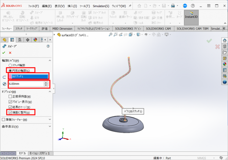 ⑥【挿入】>【サーフェス】>【スイープ】をクリックし、輪郭に⑤で作図したスケッチ、パスに④で作図したスケッチを選択します。
