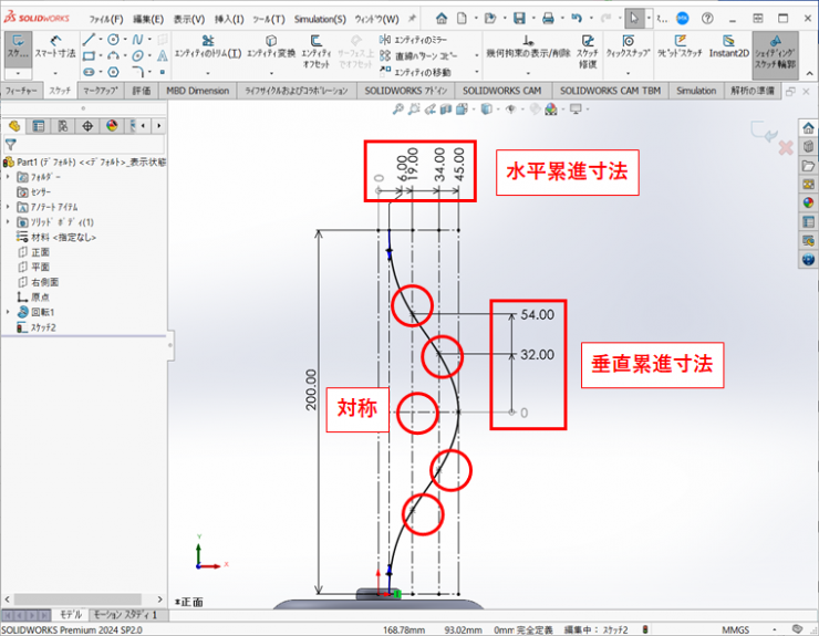 【垂直累進寸法】で、スプライン点に寸法を追加します。