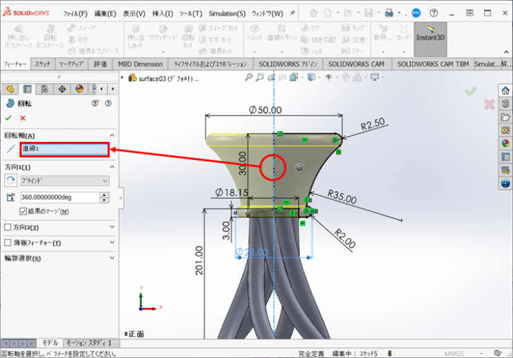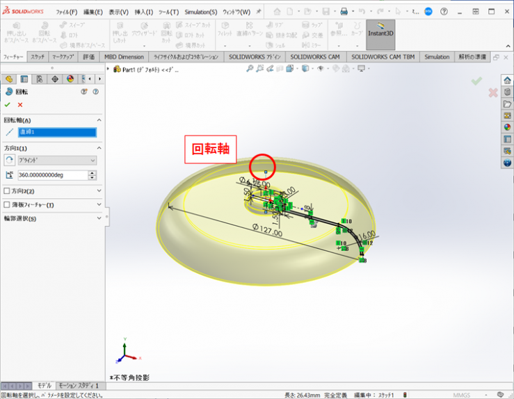 フィーチャータブの【回転 ボス/ベース】をクリックし、Y軸を軸に回転体を作成します。