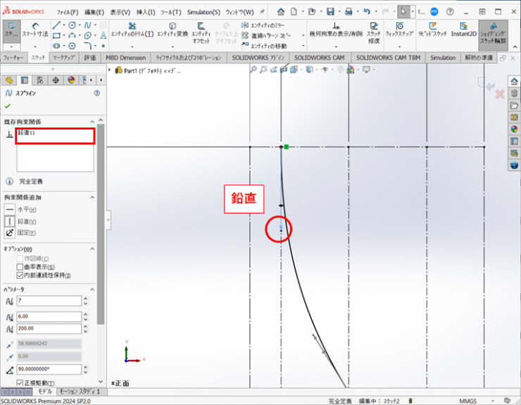 上端にあるスプラインハンドル(矢印)をクリックし【鉛直】の拘束を追加します。