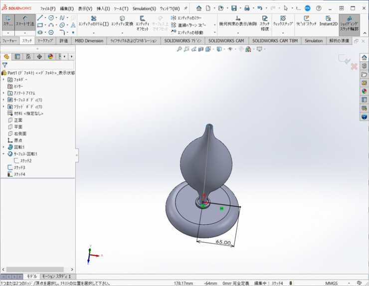 2.正面にスケッチを作図し、回転サーフェスを作成します。